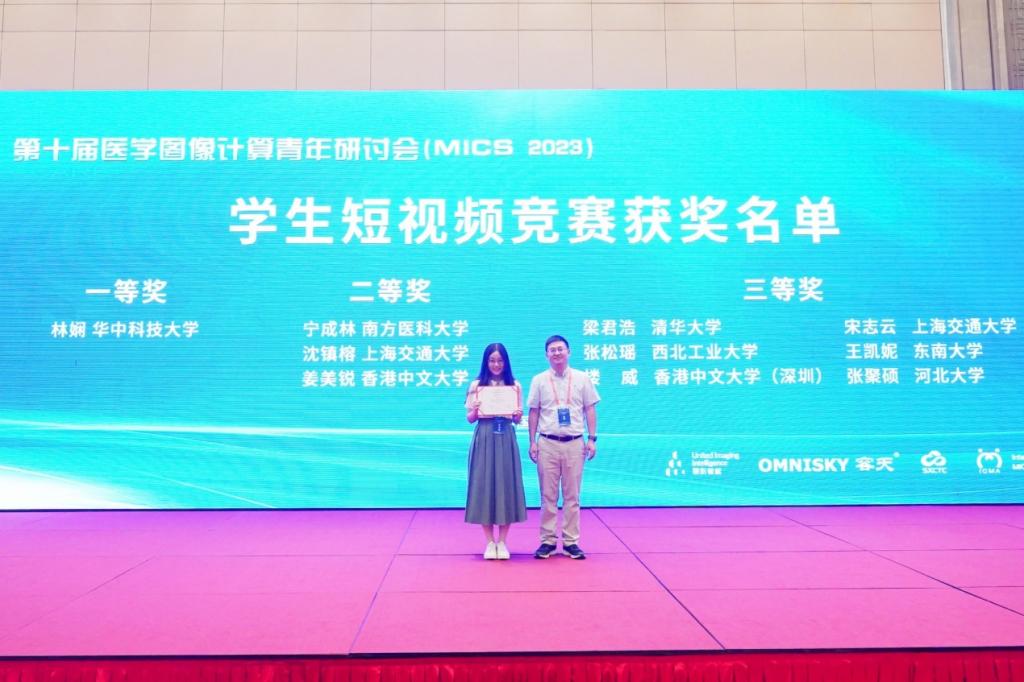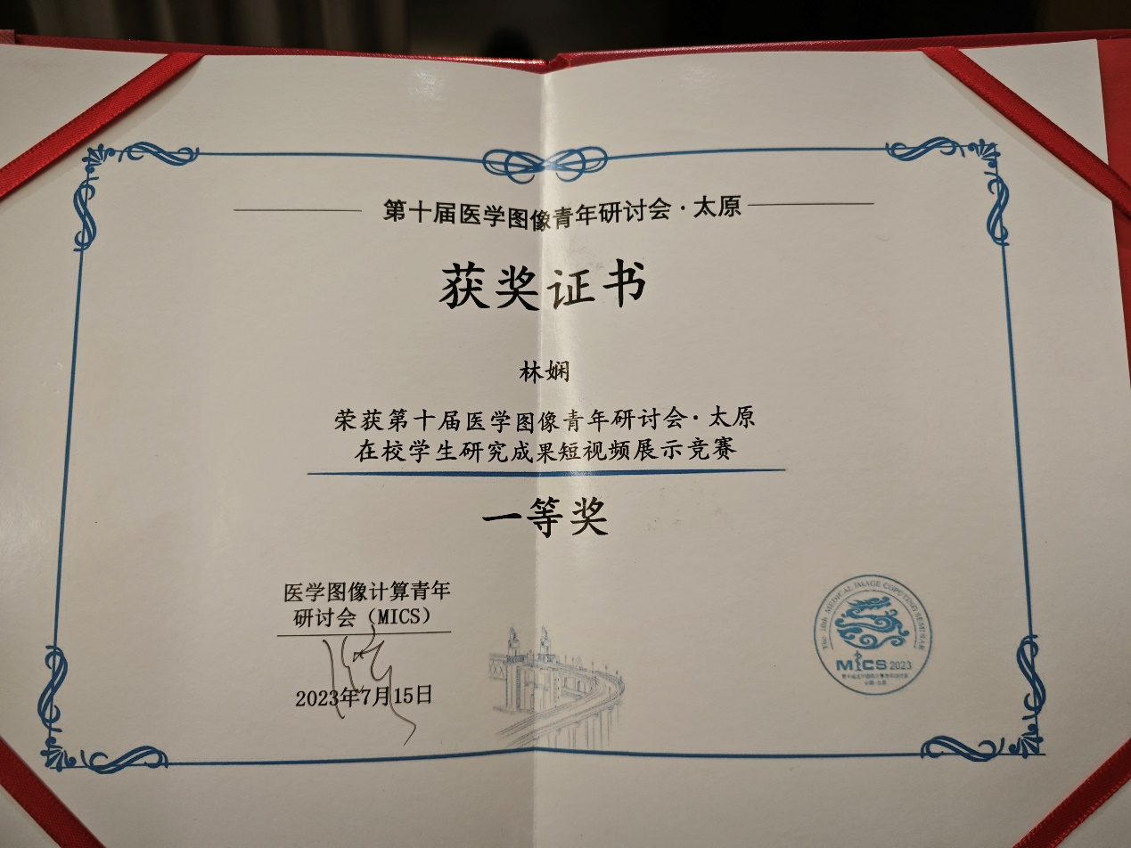 2023年7月,第十届医学图像计算青年研讨会 (MICS 2023)在山西太原隆重举办。bwin必赢数字媒体与智能网络实验室((Digital Media and Intelligent Network, DMIN))的2022级博士生林娴在喻莉教授和闫增强副研究员的指导下,和来自清华大学、香港科技大学、香港中文大学、上海交通大学等20家高校的博士生硕士生同台竞技,最终在学生研究成果竞赛环节脱颖而出,荣获一等奖。