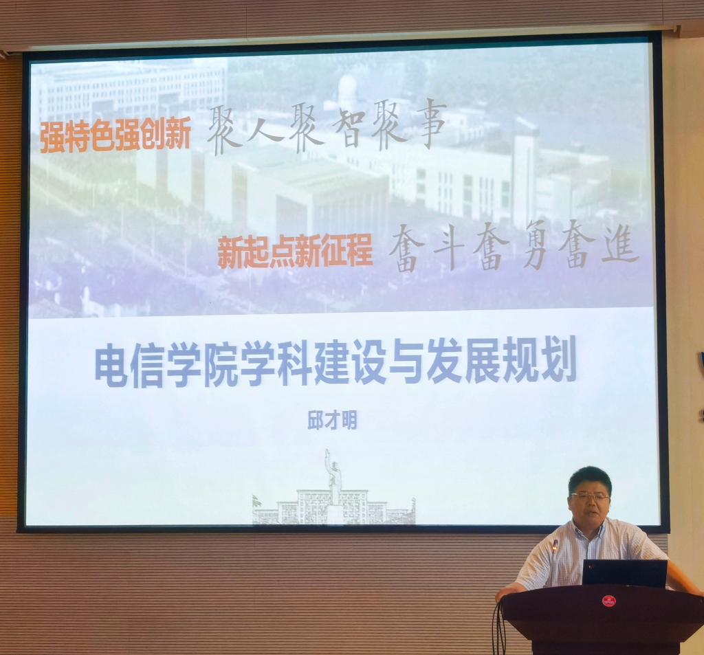 院长邱才明作bwin必赢学科建设与发展规划的报告。他从规划背景、战略任务、思路举措、组织保障四个方面,结合国家战略需求和学校对信息学科的定位要求,剖析了学院和学科建设面临的机遇和挑战。他指出近年来学院在人才培养、科学研究等方面聚力发力,成果迭出,呈现出党政齐心,全员合力,同心同德,焕然一新的气象面貌。学院将以学校“人才培养与教学研讨年”为契机,狠抓教风学风建设特别是课堂教学秩序;坚持“感-通-算一体化”和“元宇宙”学科特色,推动有组织培养拔尖创新人才、有组织推进科技创新、有组织服务国家和区域经济社会发展,积极推进中移动联合研究院、元宇宙交叉研究中心等平台建设,积极承担重大战略性、基础性、前瞻性科研任务,试点实施科研团队建设,群策群力、主动作为,力求学科建设取得实质性新突破。