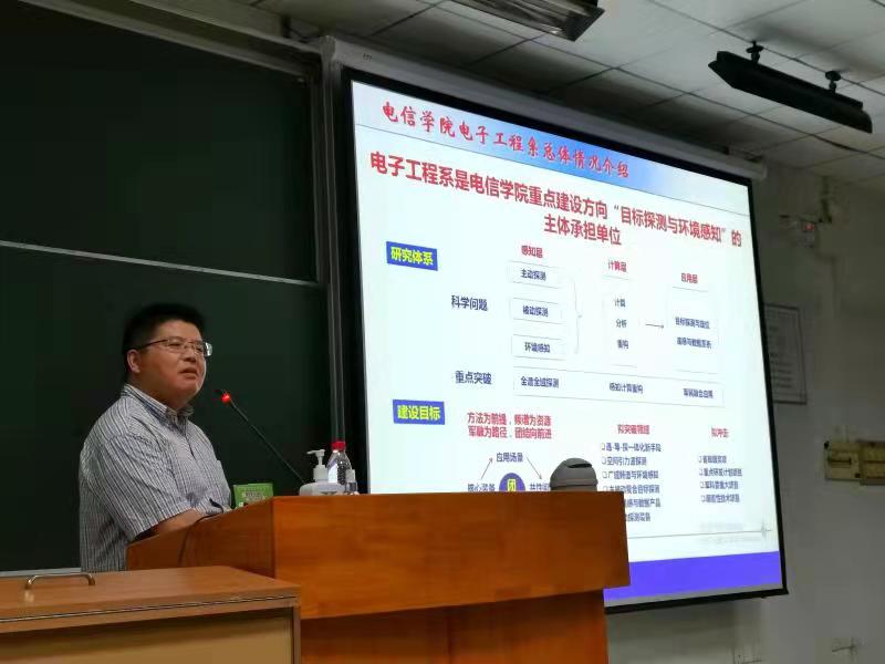 邱才明首先整体介绍了学院历史沿革、综合实力、学科建设、人才培养特色、重大科技成果、优秀校友代表等情况,指出了电子信息工程、通信工程、电磁场与无线技术三个专业的定位、建设情况及发展前沿,介绍了各专业方向与国家重大需求、社会服务相结合的情况,并展示了学院在****领域等国家主战场上的科研成就。为让新生对专业有更深层次的认知,邱才明从解读电磁波与电磁波谱等基础概念出发,梳理了电磁学的发展历史脉络,向同学们分享了伟大物理学家探索真知、发现真理的故事。