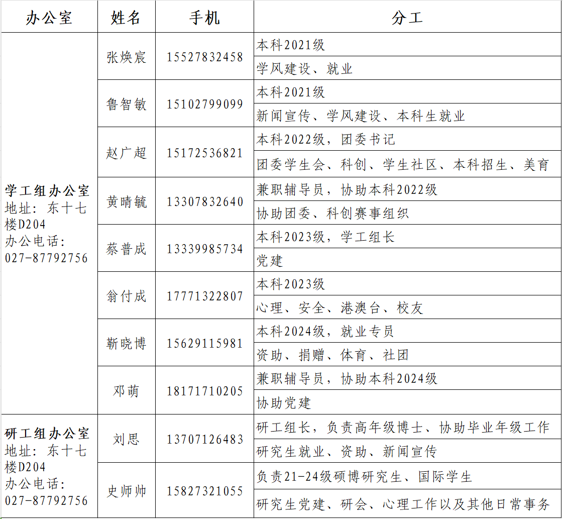 bwin必赢2024-2025学年度学生工作通讯录