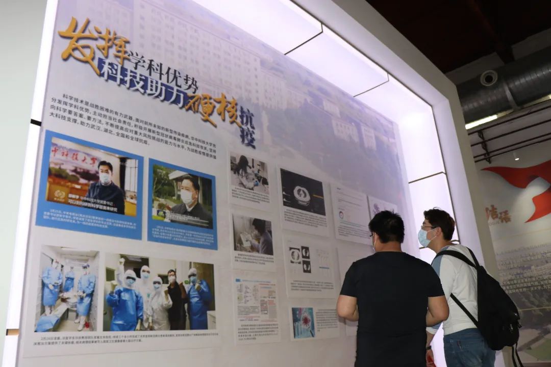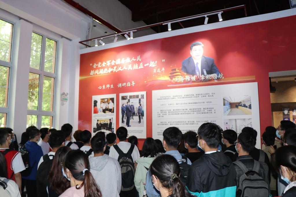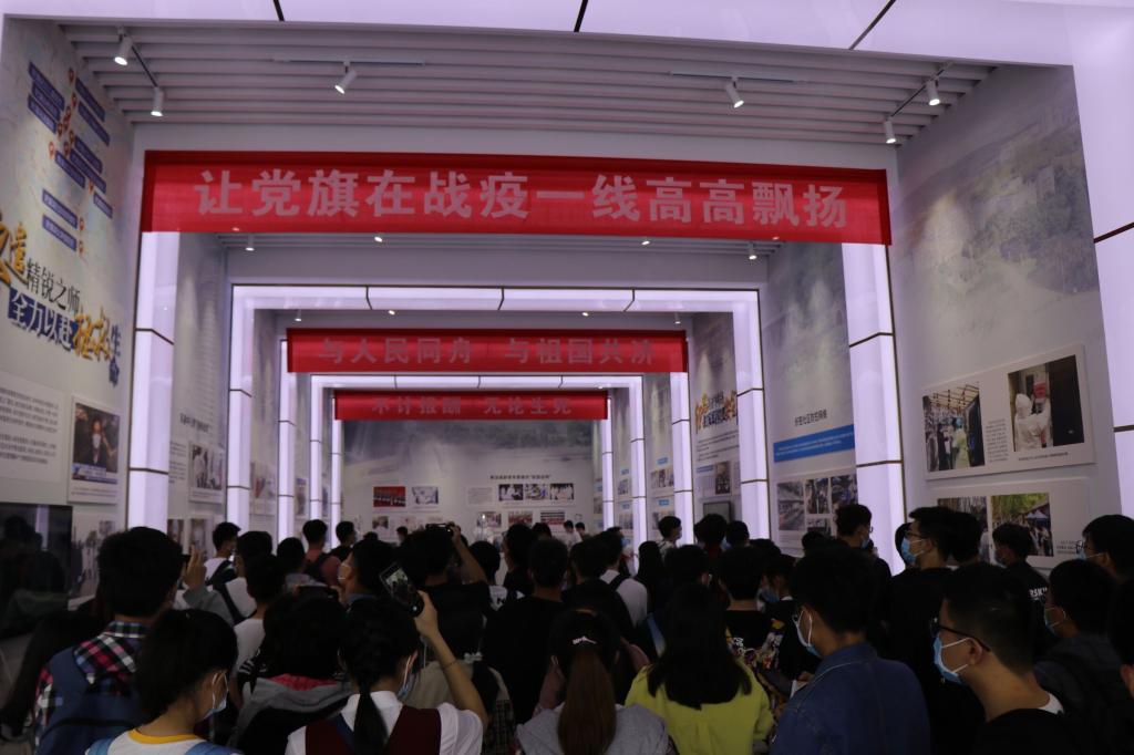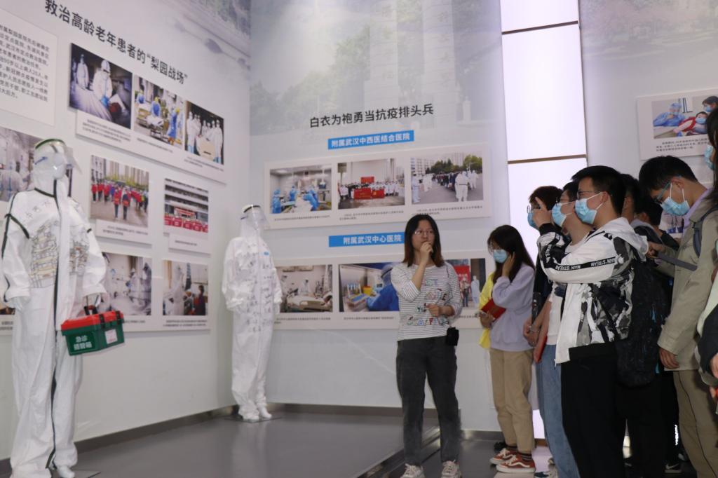 宣誓结束后,大家跟随校史馆工作人员参观了华中科技大学抗击新冠肺炎疫情专题展览。展览将战“疫”的生动画卷真实、立体地展现在我们面前,全面展现了中国人民抗疫斗争的不平凡之路。华中科技大学是此次新冠肺炎疫情中投入床位和医护人员最多的高校;不仅如此,学校还发挥自身优势,注重科研攻关与临床、防控实践相结合,将论文写在祖国的大地上,体现了高校的社会担当。