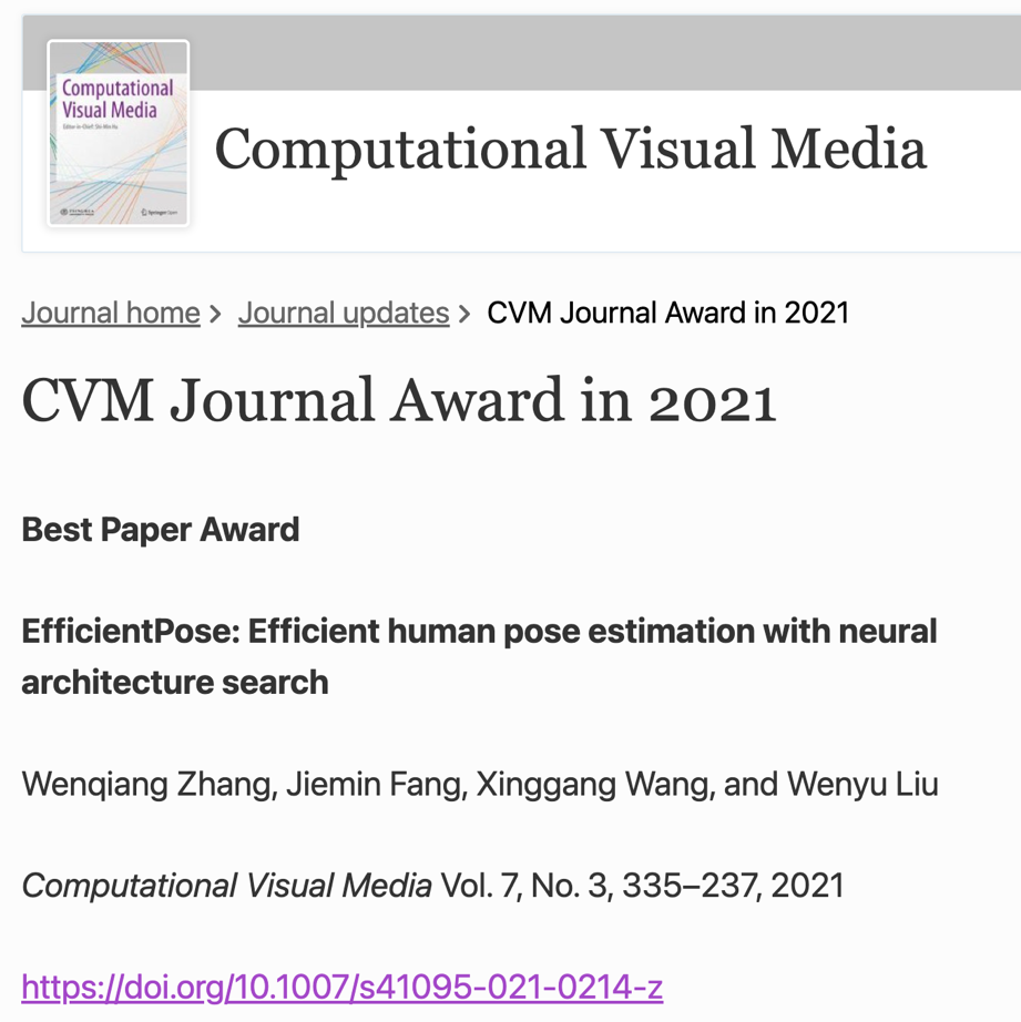 近日,bwin必赢师生论文“EfficientPose: Efficient Human Pose Estimation with Neural Architecture Search” 获得Computational Visual Media (CVMJ, 计算可视媒体) 2021年度最佳论文奖(Best Paper Award)。论文共同第一作者为bwin必赢硕士研究生张文强、博士研究生方杰民,通讯作者为bwin必赢王兴刚副教授和刘文予教授。