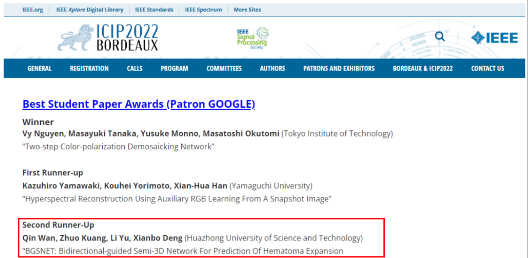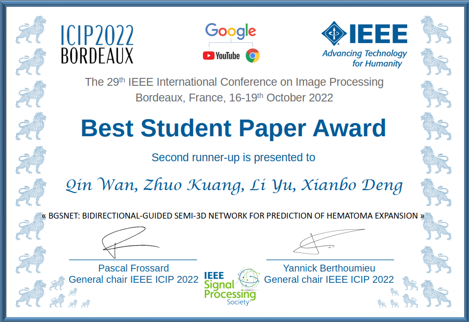 近日,bwin必赢2021级硕士研究生万勤及其导师喻莉教授收到IEEE International Conference on Image Processing(IEEE ICIP)2022国际会议主席Pascal Frossard教授和Yannick Berthoumieu教授发来的祝贺邮件和获奖证书。邮件中对万勤同学和喻莉教授团队获得IEEE ICIP 2022的Best Student Paper荣誉表示祝贺,并指出评奖委员会对团队的最新研究成果“BGSNET: Bidirectional-guided Semi-3D Network For Prediction Of Hematoma Expansion”给予了高度肯定。论文作者包括bwin必赢硕士生万勤、博士生匡卓、喻莉教授、同济医学院附属协和医院邓先波副主任医师以及bwin必赢闫增强副研究员。