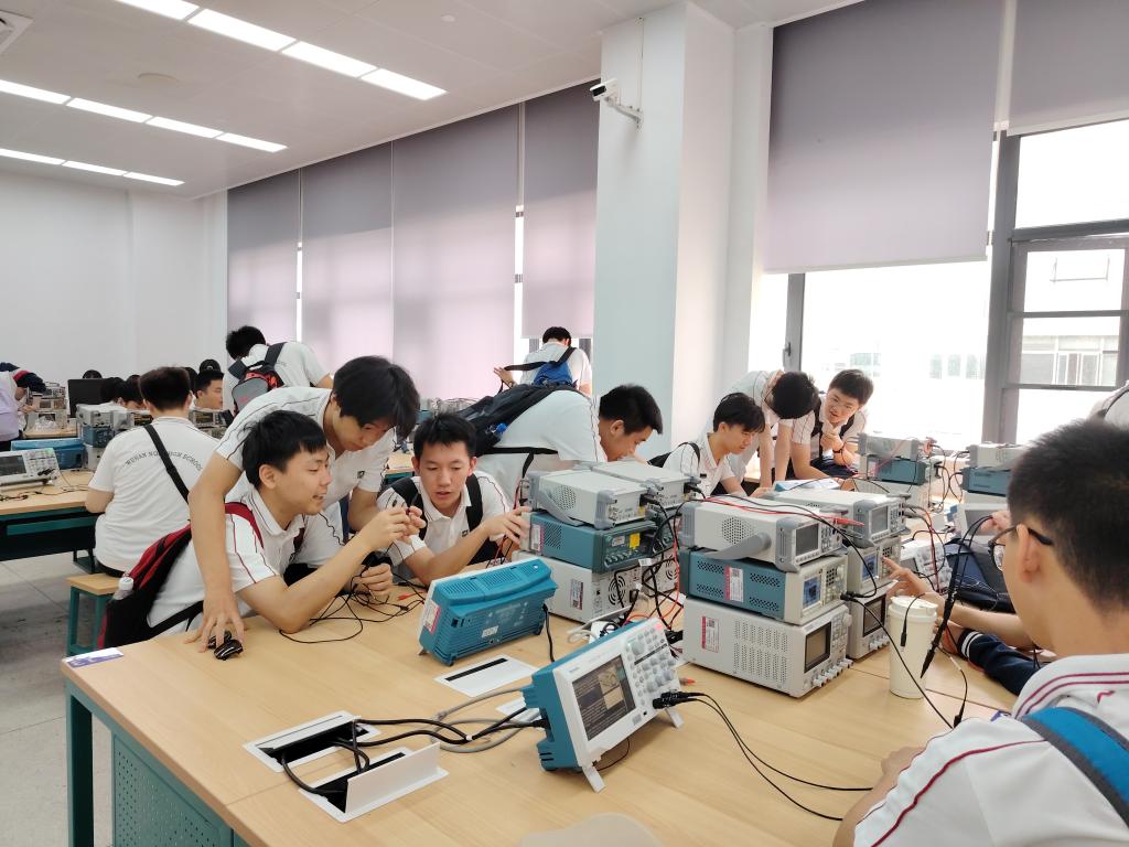 然后,夏景园工程师和朱盈盈工程师介绍实验室桌面的四件套仪器,并指导学生将仪器和测试线连接起来,进行设备调试,同学们从一开始不知如何下手,到后来调试出信号时展现出激动和欢欣的笑颜。夏景园工程师还展示了如何进行面包板布线,强调培养规范布局布线习惯。最后有兴趣的同学进入正在进行硬件课程设计的课堂,实地观察大学生的实验课程,提前体验大学课堂的自由、创新气氛。