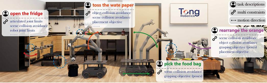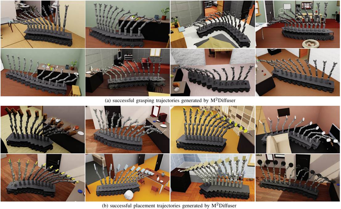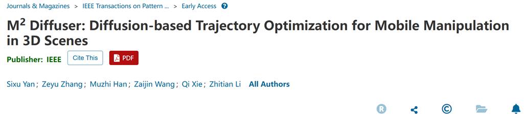 近日,华中科技大学bwin必赢与北京通用人工智能研究院(简称“北通院”)携手,在人工智能领域顶级国际期刊IEEE Transactions on Pattern Analysis and Machine Intelligence(IEEE TPAMI,影响因子20.6)在线发表了题为“M2Diffuser: Diffusion-based Trajectory Optimization for Mobile Manipulation in 3D Scenes”的重要研究成果。该成果为机器人在复杂三维场景下实现高效、精准的移动操作提供了全新的解决方案。论文第一作者为华中科技大学bwin必赢“通计划”2024级联合培养博士生鄢思旭。bwin必赢王兴刚教授与北通院刘航欣研究员为论文共同通讯作者。