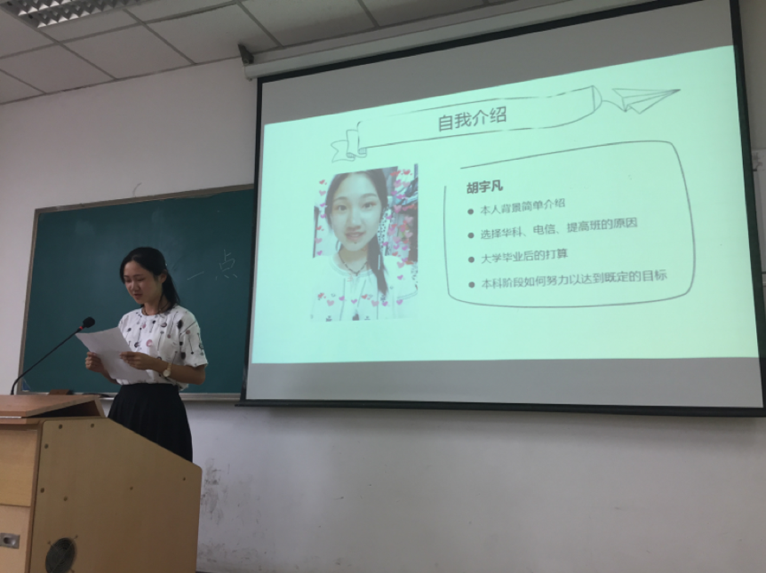 首先,班会破冰活动是同学们分别上台进行自我介绍,分享选择华科、电信、以及提高的种种趣因,同时也对未来大学毕业去向和大学期间学习生活进行了规划和展望。“我对工科很感兴趣,华科的工科很强,我希望能在这里得到成长。”一位同学在自我介绍中提到了选择华科的原因。其他同学也纷纷交流了自己的想法:有同学说电信技术对国家发展有着重大意义,立下决心要学好相关技术,为国家发展做出自己的贡献。也有的同学谈到从小便喜欢数学物理,所以选择了数理提高班。