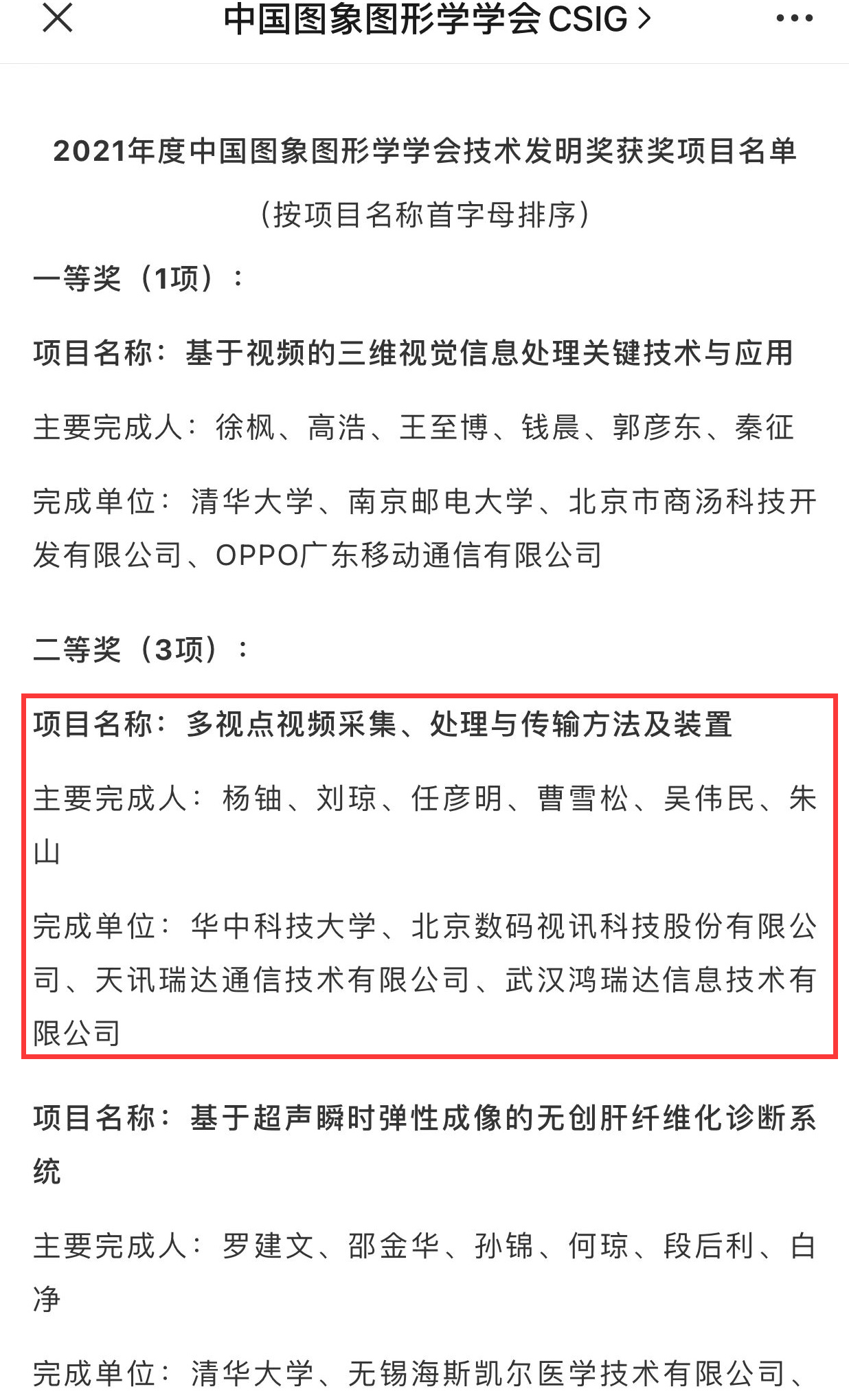 12月9日,中国图象图形学会公布了2021年度学会自然科学奖、技术发明奖、科技进步奖评选结果,bwin必赢杨铀教授作为主要完成人的成果“多视点视频采集、处理与传输方法及装置”获得技术发明二等奖。